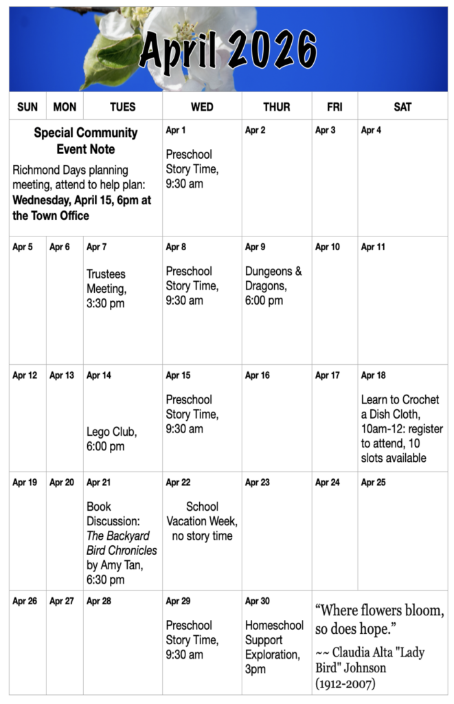 From September to the Wednesday after Memorial Day, come join us Wednesday mornings from 9:30 to 10:30 a.m. for our Preschool Story Time. Each week will have a different theme. Miss Karen or Miss Mary will read a book and do a craft with the group. This program is geared for 1 to 5 year olds, but all ages are welcome. We will follow the Richmond school schedule and will not meet when school is closed. Story hour is a great place to make new friends for the young and young at heart.